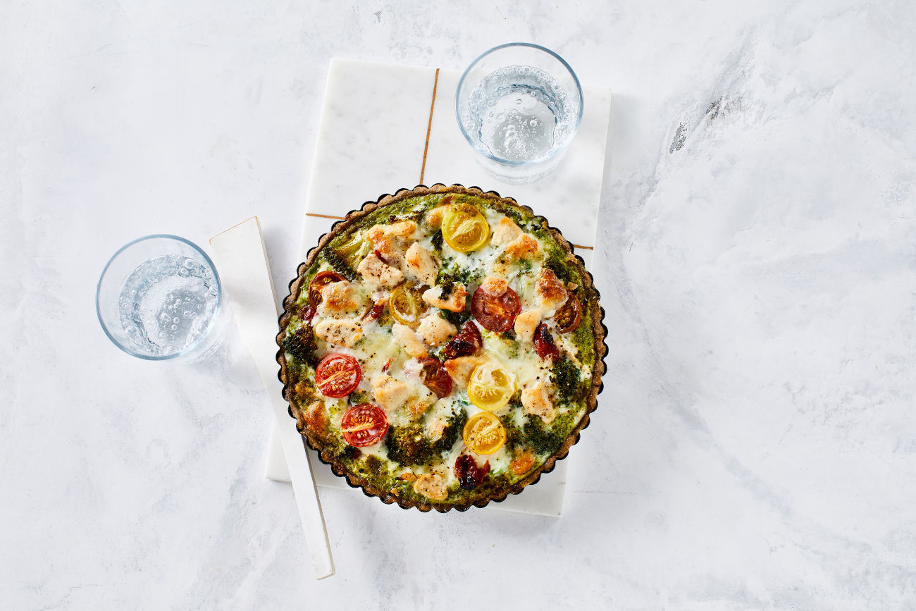 5. Levitä parsakaalit, sipulit ja aurinkokuivatut tomaatit piirakkapohjalle