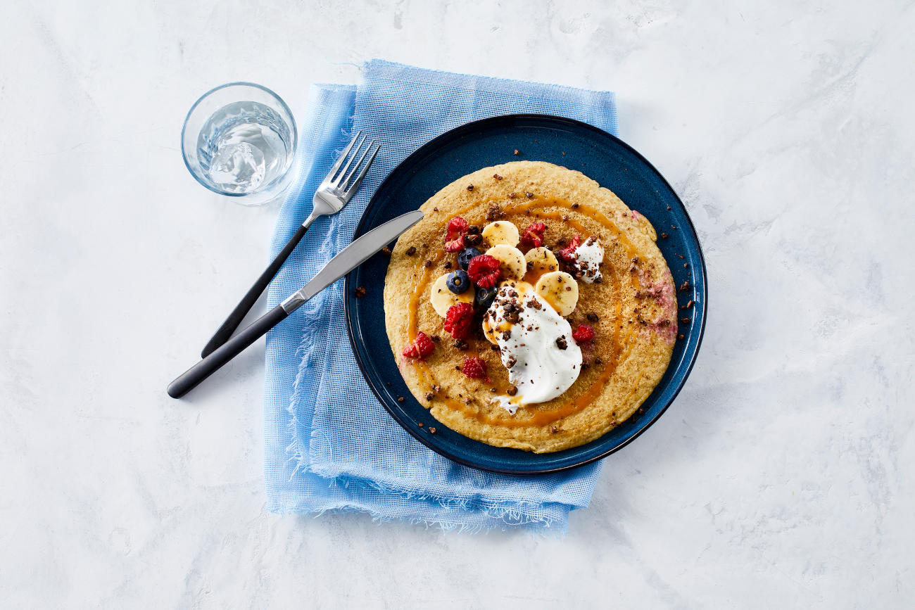 - Koristele lettu viipaloidulla banaanilla ja marjoilla ja koristele kinuskikastikkeella ja kaakaonibseillä.