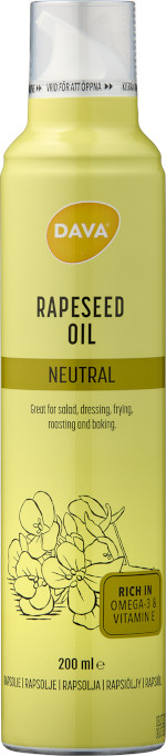 Neutraali DAVA Rapsiöljyspray 200 ml on kätevä jokapäiväiseen paistamiseen ja kesän grillailuun – kerran kokeiltua tästä on mahdoton luopua! Rapsiöljy on lämpöstabiilia ja sitä voidaan käyttää paistamiseen, sillä öljy säilyttää hyvät rasvahapponsa korkeissa lämpötiloissa eikä jätä haitallisia aineita – vaikka ruoka palaisi. Sisältää runsaasti E-vitamiinia ja omega-3 rasvahappoja.